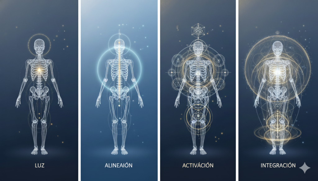 Aquí ocurre la expansión. Encendemos la estructura profunda que vive dentro de ti: tu Merkaba, tu campo de conciencia y tu geometría sagrada. Comprendes cómo funciona tu Cuerpo de Luz, cómo se activa y cómo se sostiene. Este módulo te devuelve poder, claridad y visión. Es el momento en el que dejas de caminar con los ojos cerrados y empiezas a moverte desde tu luz real.